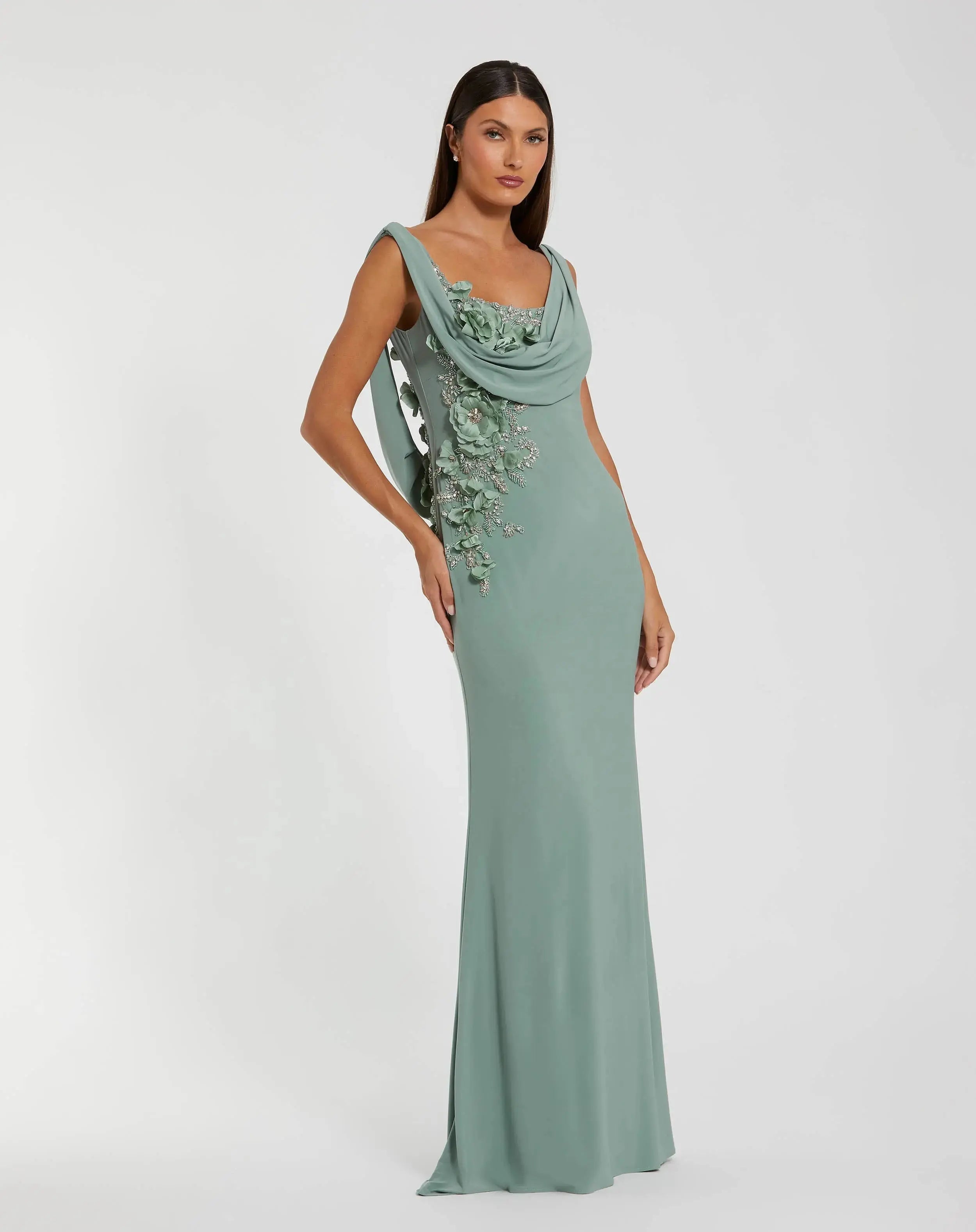 Green Sleeveless Jersey Cowl Neck Gown With Beading