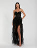 This stunning gown boasts a strapless sweetheart neckline that flatters the shoulders and décolletage. The spiral ruffles add a touch of whimsy and movement, while the thigh high slit adds a sultry element.