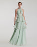 Green High Neck Chiffon Tiered Gown with Cut Out