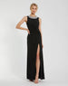 This stunning gown is crafted from soft jersey fabric, featuring a high neckline and sleeveless design for a sleek and modern look. The twist and ruched waist add flattering shape, while the embellished neckline brings a touch of sparkle. A daring thigh-high slit completes the design, making it perfect for any glamorous evening event.