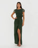 Dark Green Beaded Cap Sleeve Crepe Gown With Bow and Slit