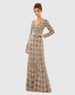 Ombré evening gown with geometric embellishment throughout the mesh overlay. This elegant long-sleeve evening gown features a hand-beaded belt at the natural waist and a floor-length trumpet skirt.