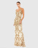 Stunning gown with allover leaf-patterned beaded embellishment, a plunging illusion v-neckline, and an elegant train.