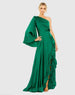 This elegant satin gown features a one shoulder neckline, a long ruffle sleeve, and a high low hemline.