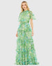 Green Floral Print Chiffon Cascading Ruffle Raglan Gown