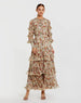 Beige Floral Tiered Ruffle Midi Dress with Long Sleeves