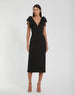This elegant midi dress is crafted from smooth crepe fabric, offering a sleek and flattering fit. The V-neckline enhances the sophistication, while the sleeveless design highlights your shoulders. The eye-catching bow shoulder detailing adds a touch of feminine charm, making this dress perfect for special occasions or any event where you want to stand out in style.