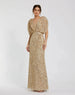 Sequin gown with v-neckline, ruched detailing, and draped short sleeves.