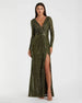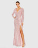 Long sleeved fully sequined evening gown accented with a ruched waist and thigh-high front slit.